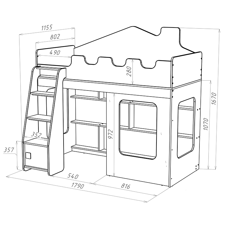 Особенностью этой модели является наличие прямой лестницы с дверцей, которая не только придает кровати-домику особый шарм, но и обеспечивает легкий и безопасный доступ к спальному месту. Стеллаж, расположенный внизу спального места, предоставляет дополнительные возможности для хранения вещей и игрушек.